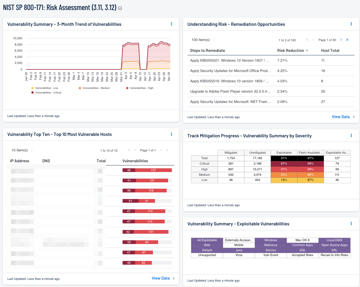 This dashboard aligns with the Risk Assessment (section 3.11) and Security Assessment (section 3.12) families of security requirements in NIST SP 800-171. These families are closely related and focus on risk assessment and vulnerability management. Components on this dashboard provide a high-level overview of an organization's vulnerability management program and can assist the organization in identifying vulnerabilities, prioritizing remediations, and tracking remediation progress. In addition, the dashboard allows for easily drilling down into the data to gain more detailed vulnerability information. This information will assist the organization in securing their systems that process, store, or transmit CUI. If necessary, assets or subnet filters can be used to narrow the focus of this dashboard to only those systems that process, store, or transmit CUI.